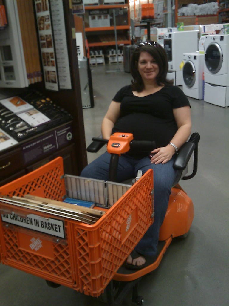 Dina had already made the decision she was going to use one of the motorized carts if it was available. I dropped her off at the door and parked. When I made it inside she had already claimed the one scooter that was left. We got the armrests adjusted and with a quick survey of the controls she was moving. I made sure to try and give her plenty of room. It’s one thing for her to bump you with a push cart/basket (ask Mr. Glaze), but I really didn’t want to become Home Depot Road Kill and be run down in the aisle by a pregnant woman!